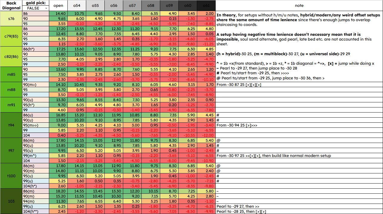 For building to setup coords, every block stacked up is 0.45s, every block bridged is 0.40s and every diagonal bridge is 0.50s, with every staircase towards coords considered fully overlapped by stacking up. I think soul sand alternating is not worth having a separate sheet for, but it is still a measureable time save on a few setups.