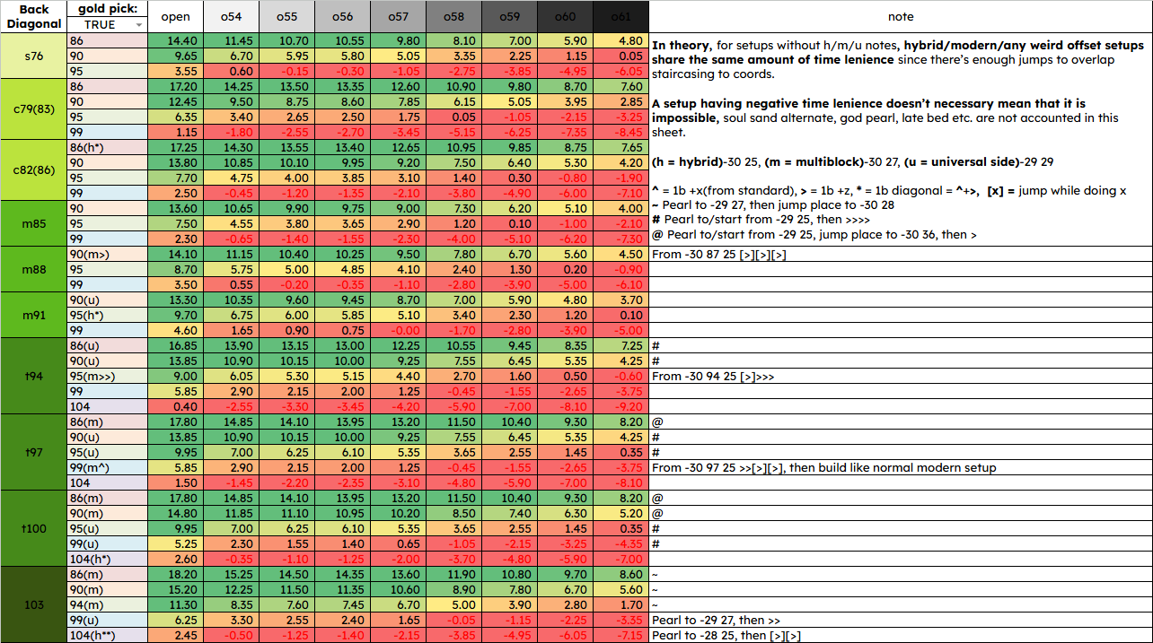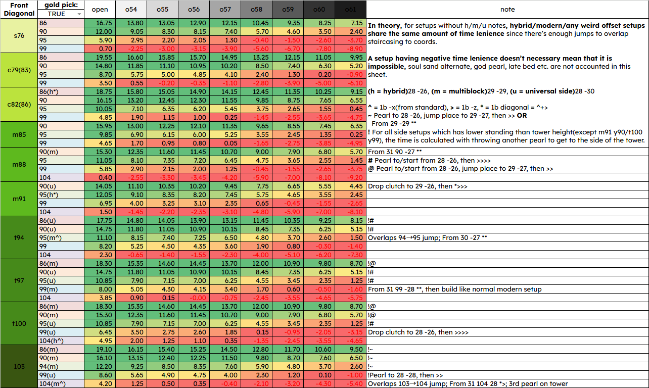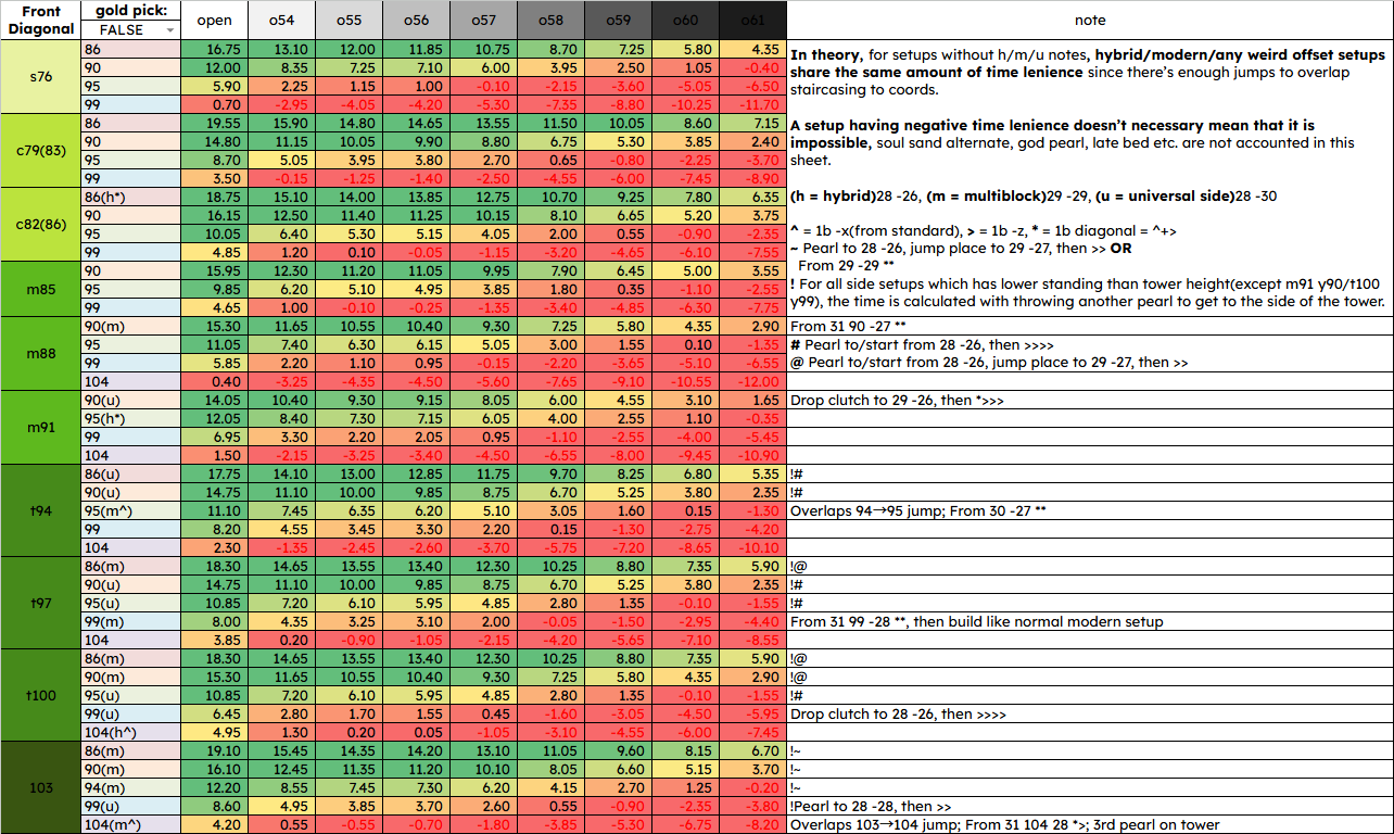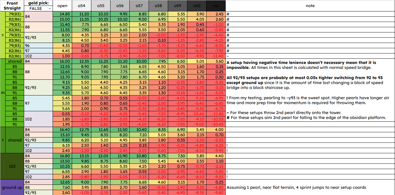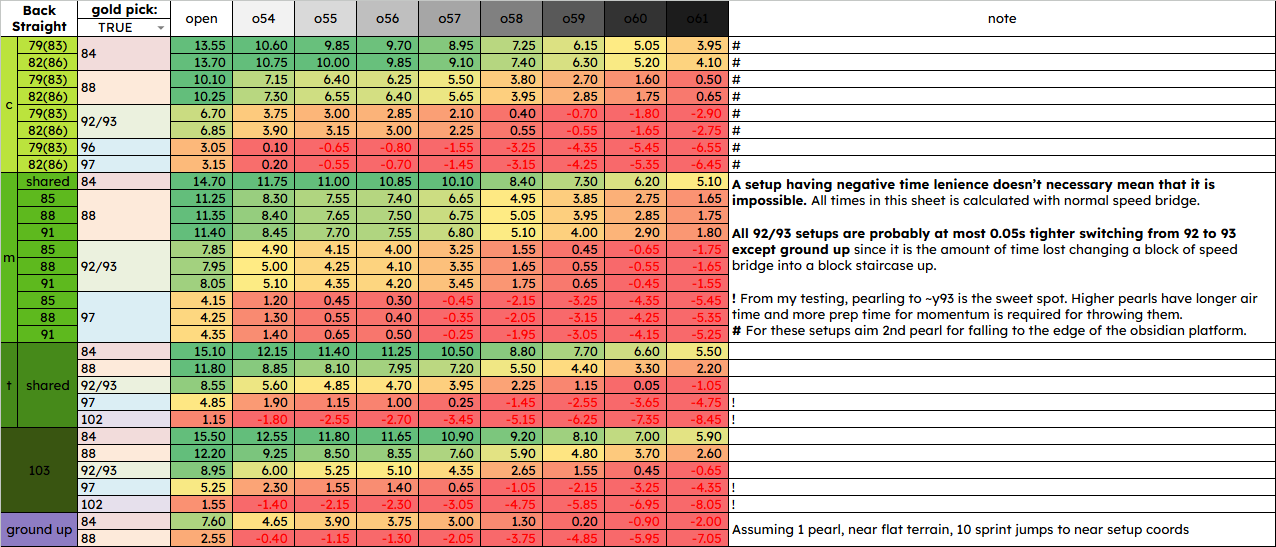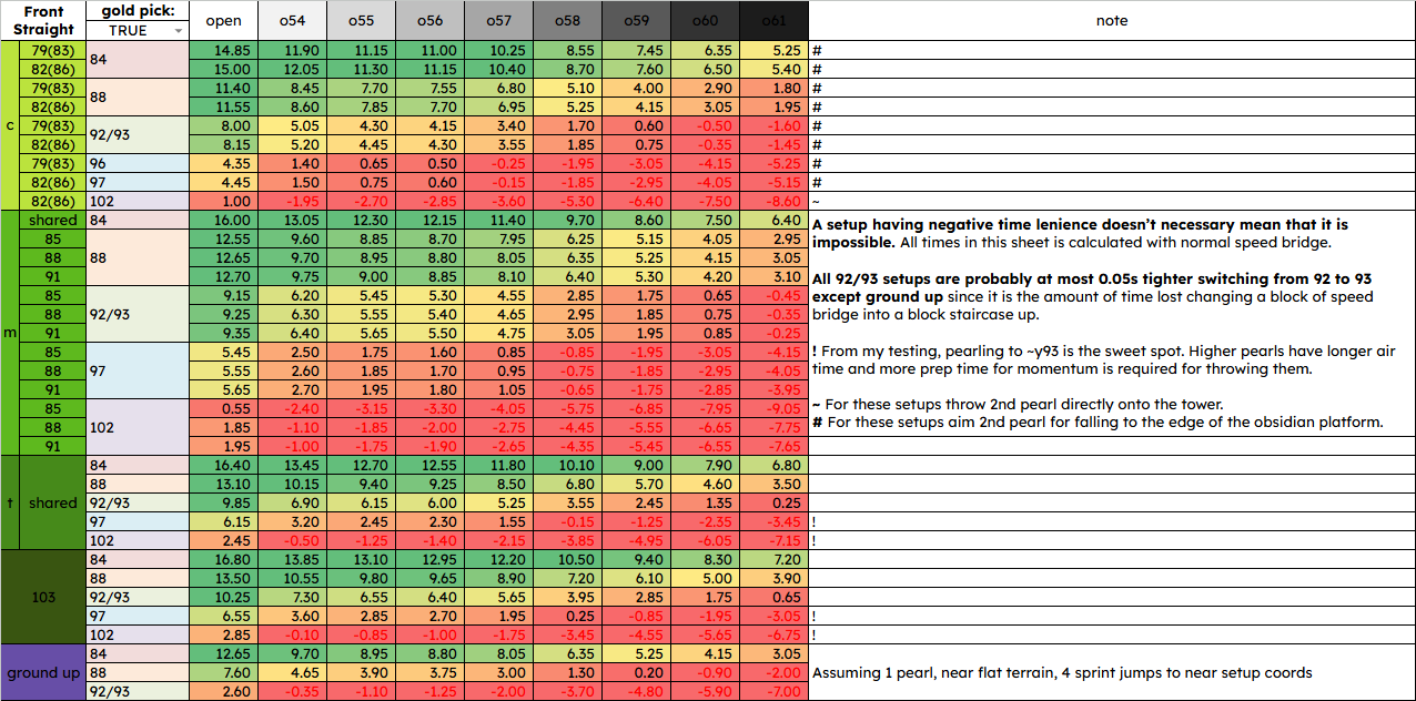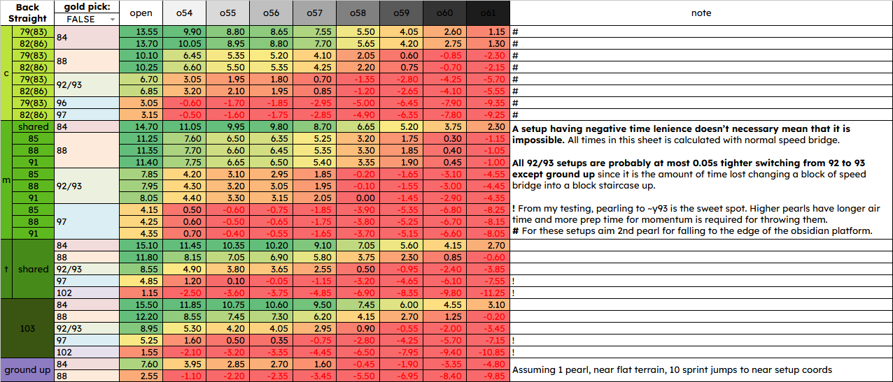 All the times listed in the sheet follows the principle of being consistently repreducable, so it is way closer to a top runner doing zero cycles in a real ranked run than TAS throwing every pearl perfectly saving 0.5 second on every single split. In my opinion this makes the sheet more referencable for how possible/whether to go for or not in real run conditions. This results in several setups despite being listed as having negative time allowance are actually very hittable, for example, I myself had hit open front m85 y103, which will be -0.35s if it is on the sheet.
