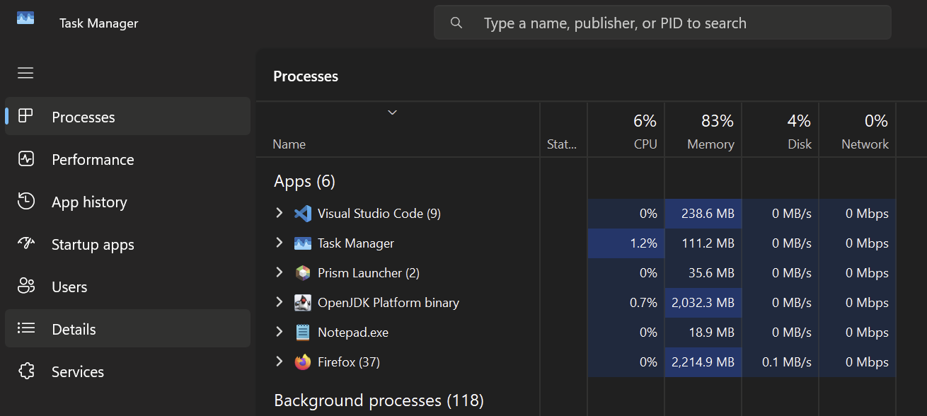 click on that, and then we need to find javaw.exe. there’s also a rare chance you’re using java.exe. if the details tab is not sorted by name then clicking on the title of the name column will make it so. if you have multiple javaw.exes, make sure you don’t have multiple instances open, or other java programs (close ninjabrain bot). also, if it’s some random java program like modcheck you can usually tell by cpu usage (focus the game and spin around, cpu usage will spike a bit for one entry).
